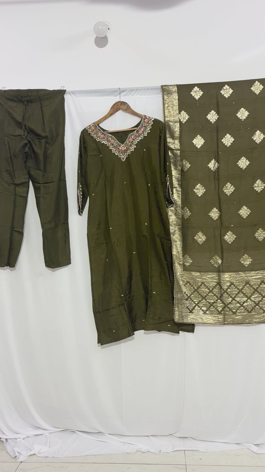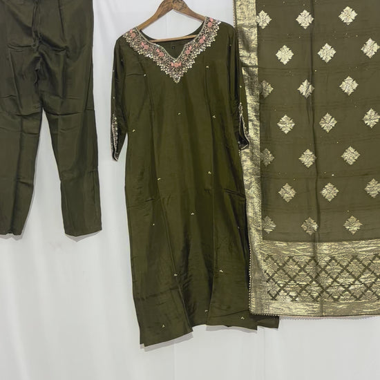 Experience elegance with this Festive Wear Mehendi Green Kurta Set crafted from soft and comfortable dola silk fabric. Designed with a straight cut and handmade detailing, it offers both style and ease for special occasions. Affordable yet sophisticated, this kurta set is perfect for women seeking festive charm without compromising comfort.